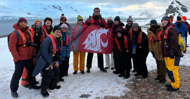 WSU students and faculty took the WSU flag on their Antarctica study abroad adventure.